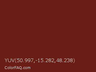 YUV 50.997,-15.282,48.238 Color is a dark red color and the nearest color is Moccaccino #6e1d14. Hex code #6a1d14 and RGB value is rgb(106,29,20). In RGB color space, this color is composed of 42% red, 11% green, 8% blue, In CMYK color space, this color is composed of 0% cyan, 73% magenta, 81% yellow , 58% black , In HSL color space, this color has a hue angle of 6° , 68% saturation and 25% lightness.