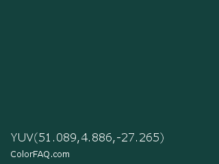 YUV 51.089,4.886,-27.265 Color is a very dark cyan color and the nearest color is MSU Green #18453b. Hex code #14413d and RGB value is rgb(20,65,61). In RGB color space, this color is composed of 8% red, 25% green, 24% blue, In CMYK color space, this color is composed of 69% cyan, 0% magenta, 6% yellow , 75% black , In HSL color space, this color has a hue angle of 175° , 53% saturation and 17% lightness.