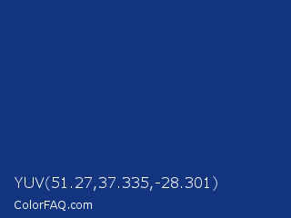 YUV 51.27,37.335,-28.301 Color is a dark blue color and the nearest color is Catalina Blue #062a78. Hex code #13357f and RGB value is rgb(19,53,127). In RGB color space, this color is composed of 7% red, 21% green, 50% blue, In CMYK color space, this color is composed of 85% cyan, 58% magenta, 0% yellow , 50% black , In HSL color space, this color has a hue angle of 221° , 74% saturation and 29% lightness.