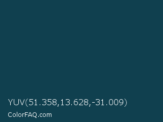 YUV 51.358,13.628,-31.009 Color is a very dark blue color and the nearest color is Tarawera #073a50. Hex code #10404f and RGB value is rgb(16,64,79). In RGB color space, this color is composed of 6% red, 25% green, 31% blue, In CMYK color space, this color is composed of 80% cyan, 19% magenta, 0% yellow , 69% black , In HSL color space, this color has a hue angle of 194° , 66% saturation and 19% lightness.