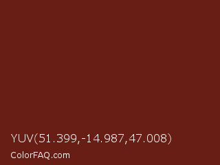 YUV 51.399,-14.987,47.008 Color is a dark red color and the nearest color is Moccaccino #6e1d14. Hex code #691e15 and RGB value is rgb(105,30,21). In RGB color space, this color is composed of 41% red, 12% green, 8% blue, In CMYK color space, this color is composed of 0% cyan, 71% magenta, 80% yellow , 59% black , In HSL color space, this color has a hue angle of 6° , 67% saturation and 25% lightness.