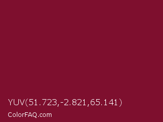 YUV 51.723,-2.821,65.141 Color is a dark rose color and the nearest color is Claret #7f1734. Hex code #7e0f2e and RGB value is rgb(126,15,46). In RGB color space, this color is composed of 49% red, 6% green, 18% blue, In CMYK color space, this color is composed of 0% cyan, 88% magenta, 63% yellow , 51% black , In HSL color space, this color has a hue angle of 343° , 79% saturation and 28% lightness.