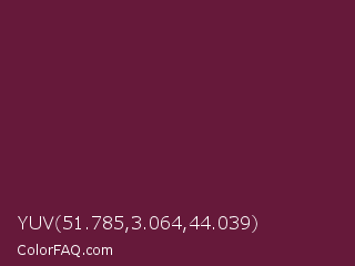 YUV 51.785,3.064,44.039 Color is a dark rose color and the nearest color is Wine Berry #591d35. Hex code #66193a and RGB value is rgb(102,25,58). In RGB color space, this color is composed of 40% red, 10% green, 23% blue, In CMYK color space, this color is composed of 0% cyan, 75% magenta, 43% yellow , 60% black , In HSL color space, this color has a hue angle of 334° , 61% saturation and 25% lightness.