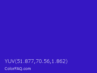 YUV 51.877,70.56,1.862 Color is a normal indigo color and the nearest color is Interdimensional Blue #360ccc. Hex code #3617c3 and RGB value is rgb(54,23,195). In RGB color space, this color is composed of 21% red, 9% green, 76% blue, In CMYK color space, this color is composed of 72% cyan, 88% magenta, 0% yellow , 24% black , In HSL color space, this color has a hue angle of 251° , 79% saturation and 43% lightness.
