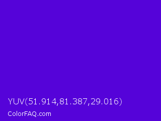 YUV 51.914,81.387,29.016 Color is a normal violet color and the nearest color is Interdimensional Blue #360ccc. Hex code #5503d9 and RGB value is rgb(85,3,217). In RGB color space, this color is composed of 33% red, 1% green, 85% blue, In CMYK color space, this color is composed of 61% cyan, 99% magenta, 0% yellow , 15% black , In HSL color space, this color has a hue angle of 263° , 97% saturation and 43% lightness.