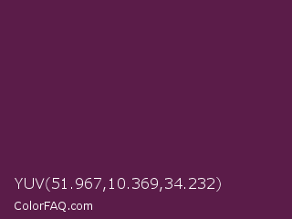 YUV 51.967,10.369,34.232 Color is a dark magenta color and the nearest color is Tawny Port #692545. Hex code #5b1c49 and RGB value is rgb(91,28,73). In RGB color space, this color is composed of 36% red, 11% green, 29% blue, In CMYK color space, this color is composed of 0% cyan, 69% magenta, 20% yellow , 64% black , In HSL color space, this color has a hue angle of 317° , 53% saturation and 23% lightness.