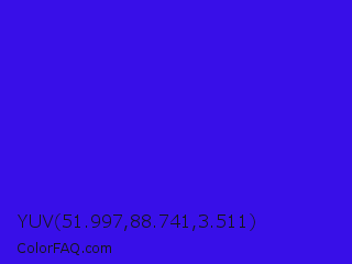 YUV 51.997,88.741,3.511 Color is a normal indigo color and the nearest color is Interdimensional Blue #360ccc. Hex code #380fe8 and RGB value is rgb(56,15,232). In RGB color space, this color is composed of 22% red, 6% green, 91% blue, In CMYK color space, this color is composed of 76% cyan, 94% magenta, 0% yellow , 9% black , In HSL color space, this color has a hue angle of 251° , 88% saturation and 48% lightness.