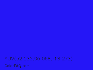 YUV 52.135,96.068,-13.273 Color is a normal indigo color and the nearest color is Bluebonnet #1c1cf0. Hex code #2516f7 and RGB value is rgb(37,22,247). In RGB color space, this color is composed of 15% red, 9% green, 97% blue, In CMYK color space, this color is composed of 85% cyan, 91% magenta, 0% yellow , 3% black , In HSL color space, this color has a hue angle of 244° , 93% saturation and 53% lightness.