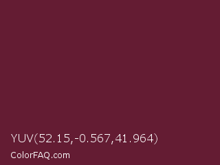 YUV 52.15,-0.567,41.964 Color is a dark rose color and the nearest color is Wine Berry #591d35. Hex code #641c33 and RGB value is rgb(100,28,51). In RGB color space, this color is composed of 39% red, 11% green, 20% blue, In CMYK color space, this color is composed of 0% cyan, 72% magenta, 49% yellow , 61% black , In HSL color space, this color has a hue angle of 341° , 56% saturation and 25% lightness.