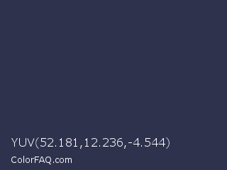 YUV 52.181,12.236,-4.544 Color is a dark blue color and the nearest color is Martinique #363050. Hex code #2f324d and RGB value is rgb(47,50,77). In RGB color space, this color is composed of 18% red, 20% green, 30% blue, In CMYK color space, this color is composed of 39% cyan, 35% magenta, 0% yellow , 70% black , In HSL color space, this color has a hue angle of 234° , 24% saturation and 24% lightness.