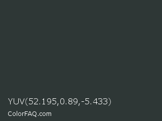 YUV 52.195,0.89,-5.433 Color is a very dark cyan color and the nearest color is Outer Space Crayola #2d383a. Hex code #2e3736 and RGB value is rgb(46,55,54). In RGB color space, this color is composed of 18% red, 22% green, 21% blue, In CMYK color space, this color is composed of 16% cyan, 0% magenta, 2% yellow , 78% black , In HSL color space, this color has a hue angle of 173° , 9% saturation and 20% lightness.