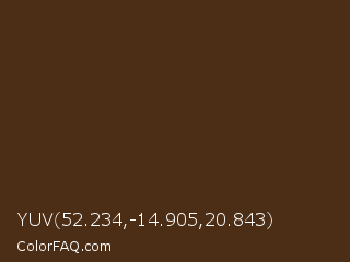 YUV 52.234,-14.905,20.843 Color is a very dark orange color and the nearest color is Brown Derby #492615. Hex code #4c2e16 and RGB value is rgb(76,46,22). In RGB color space, this color is composed of 30% red, 18% green, 9% blue, In CMYK color space, this color is composed of 0% cyan, 39% magenta, 71% yellow , 70% black , In HSL color space, this color has a hue angle of 27° , 55% saturation and 19% lightness.