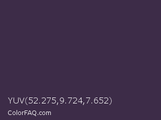 YUV 52.275,9.724,7.652 Color is a dark purple color and the nearest color is Martinique #363050. Hex code #3d2c48 and RGB value is rgb(61,44,72). In RGB color space, this color is composed of 24% red, 17% green, 28% blue, In CMYK color space, this color is composed of 15% cyan, 39% magenta, 0% yellow , 72% black , In HSL color space, this color has a hue angle of 276° , 24% saturation and 23% lightness.