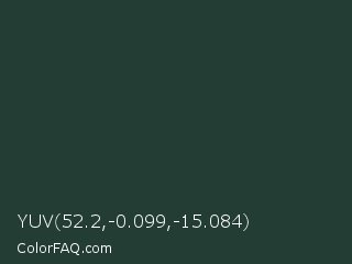 YUV 52.2,-0.099,-15.084 Color is a very dark green color and the nearest color is Everglade #1c402e. Hex code #233d34 and RGB value is rgb(35,61,52). In RGB color space, this color is composed of 14% red, 24% green, 20% blue, In CMYK color space, this color is composed of 43% cyan, 0% magenta, 15% yellow , 76% black , In HSL color space, this color has a hue angle of 159° , 27% saturation and 19% lightness.