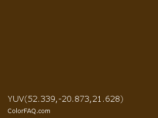 YUV 52.339,-20.873,21.628 Color is a very dark orange color and the nearest color is Deep Bronze #4a3004. Hex code #4d300a and RGB value is rgb(77,48,10). In RGB color space, this color is composed of 30% red, 19% green, 4% blue, In CMYK color space, this color is composed of 0% cyan, 38% magenta, 87% yellow , 70% black , In HSL color space, this color has a hue angle of 34° , 77% saturation and 17% lightness.