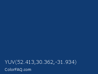 YUV 52.413,30.362,-31.934 Color is a dark blue color and the nearest color is Regal Blue #013f6a. Hex code #103b72 and RGB value is rgb(16,59,114). In RGB color space, this color is composed of 6% red, 23% green, 45% blue, In CMYK color space, this color is composed of 86% cyan, 48% magenta, 0% yellow , 55% black , In HSL color space, this color has a hue angle of 214° , 75% saturation and 25% lightness.