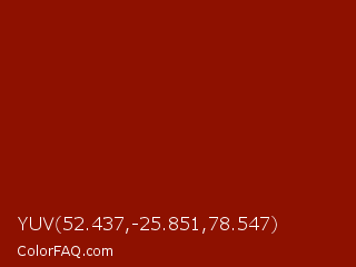 YUV 52.437,-25.851,78.547 Color is a dark red color and the nearest color is Totem Pole #991b07. Hex code #8e1100 and RGB value is rgb(142,17,-0). In RGB color space, this color is composed of 56% red, 7% green, 0% blue, In CMYK color space, this color is composed of 0% cyan, 88% magenta, 100% yellow , 44% black , In HSL color space, this color has a hue angle of 7° , 100% saturation and 28% lightness.