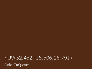 YUV 52.452,-15.506,26.791 Color is a very dark orange color and the nearest color is Jambalaya #5b3013. Hex code #532b15 and RGB value is rgb(83,43,21). In RGB color space, this color is composed of 33% red, 17% green, 8% blue, In CMYK color space, this color is composed of 0% cyan, 48% magenta, 75% yellow , 67% black , In HSL color space, this color has a hue angle of 21° , 60% saturation and 20% lightness.