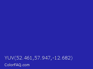 YUV 52.461,57.947,-12.682 Color is a normal blue color and the nearest color is Blue Pigment #333399. Hex code #2625aa and RGB value is rgb(38,37,170). In RGB color space, this color is composed of 15% red, 15% green, 67% blue, In CMYK color space, this color is composed of 78% cyan, 78% magenta, 0% yellow , 33% black , In HSL color space, this color has a hue angle of 240° , 64% saturation and 41% lightness.