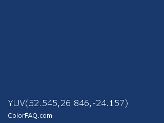 YUV 52.545,26.846,-24.157 Color is a dark blue color and the nearest color is Biscay #1b3162. Hex code #19386b and RGB value is rgb(25,56,107). In RGB color space, this color is composed of 10% red, 22% green, 42% blue, In CMYK color space, this color is composed of 77% cyan, 48% magenta, 0% yellow , 58% black , In HSL color space, this color has a hue angle of 217° , 62% saturation and 26% lightness.