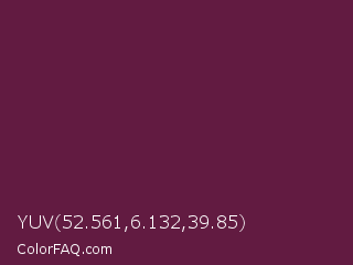 YUV 52.561,6.132,39.85 Color is a dark rose color and the nearest color is Tawny Port #692545. Hex code #621b41 and RGB value is rgb(98,27,65). In RGB color space, this color is composed of 38% red, 11% green, 25% blue, In CMYK color space, this color is composed of 0% cyan, 72% magenta, 34% yellow , 62% black , In HSL color space, this color has a hue angle of 328° , 57% saturation and 25% lightness.