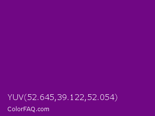 YUV 52.645,39.122,52.054 Color is a dark purple color and the nearest color is Patriarch #800080. Hex code #700784 and RGB value is rgb(112,7,132). In RGB color space, this color is composed of 44% red, 3% green, 52% blue, In CMYK color space, this color is composed of 15% cyan, 95% magenta, 0% yellow , 48% black , In HSL color space, this color has a hue angle of 290° , 90% saturation and 27% lightness.