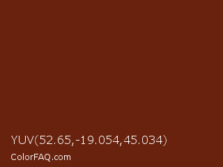 YUV 52.65,-19.054,45.034 Color is a dark red color and the nearest color is Moccaccino #6e1d14. Hex code #68220e and RGB value is rgb(104,34,14). In RGB color space, this color is composed of 41% red, 13% green, 5% blue, In CMYK color space, this color is composed of 0% cyan, 67% magenta, 87% yellow , 59% black , In HSL color space, this color has a hue angle of 13° , 76% saturation and 23% lightness.