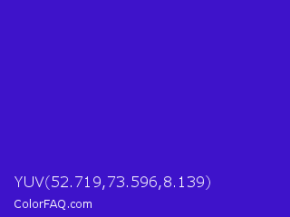 YUV 52.719,73.596,8.139 Color is a normal indigo color and the nearest color is Interdimensional Blue #360ccc. Hex code #3e13ca and RGB value is rgb(62,19,202). In RGB color space, this color is composed of 24% red, 7% green, 79% blue, In CMYK color space, this color is composed of 69% cyan, 91% magenta, 0% yellow , 21% black , In HSL color space, this color has a hue angle of 254° , 83% saturation and 43% lightness.