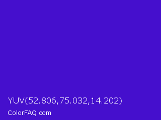YUV 52.806,75.032,14.202 Color is a normal indigo color and the nearest color is Interdimensional Blue #360ccc. Hex code #450fcd and RGB value is rgb(69,15,205). In RGB color space, this color is composed of 27% red, 6% green, 80% blue, In CMYK color space, this color is composed of 66% cyan, 93% magenta, 0% yellow , 20% black , In HSL color space, this color has a hue angle of 257° , 86% saturation and 43% lightness.