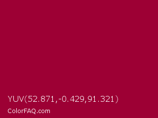 YUV 52.871,-0.429,91.321 Color is a normal rose color and the nearest color is Pink Raspberry #980036. Hex code #9d0034 and RGB value is rgb(157,-0,52). In RGB color space, this color is composed of 62% red, 0% green, 20% blue, In CMYK color space, this color is composed of 0% cyan, 100% magenta, 67% yellow , 38% black , In HSL color space, this color has a hue angle of 340° , 100% saturation and 31% lightness.