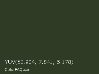 YUV 52.904,-7.841,-5.178 Color is a very dark green color and the nearest color is Rangitoto #2e3222. Hex code #2f3b25 and RGB value is rgb(47,59,37). In RGB color space, this color is composed of 18% red, 23% green, 15% blue, In CMYK color space, this color is composed of 20% cyan, 0% magenta, 37% yellow , 77% black , In HSL color space, this color has a hue angle of 93° , 23% saturation and 19% lightness.