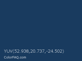 YUV 52.938,20.737,-24.502 Color is a dark blue color and the nearest color is Cello #1e385b. Hex code #193b5f and RGB value is rgb(25,59,95). In RGB color space, this color is composed of 10% red, 23% green, 37% blue, In CMYK color space, this color is composed of 74% cyan, 38% magenta, 0% yellow , 63% black , In HSL color space, this color has a hue angle of 211° , 58% saturation and 24% lightness.