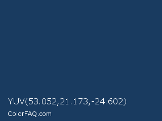 YUV 53.052,21.173,-24.602 Color is a dark blue color and the nearest color is Cello #1e385b. Hex code #193b60 and RGB value is rgb(25,59,96). In RGB color space, this color is composed of 10% red, 23% green, 38% blue, In CMYK color space, this color is composed of 74% cyan, 39% magenta, 0% yellow , 62% black , In HSL color space, this color has a hue angle of 211° , 59% saturation and 24% lightness.