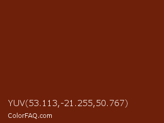YUV 53.113,-21.255,50.767 Color is a dark red color and the nearest color is Moccaccino #6e1d14. Hex code #6f200a and RGB value is rgb(111,32,10). In RGB color space, this color is composed of 44% red, 13% green, 4% blue, In CMYK color space, this color is composed of 0% cyan, 71% magenta, 91% yellow , 56% black , In HSL color space, this color has a hue angle of 13° , 83% saturation and 24% lightness.