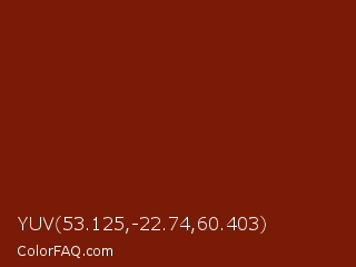 YUV 53.125,-22.74,60.403 Color is a dark red color and the nearest color is Kenyan Copper #7c1c05. Hex code #7a1b07 and RGB value is rgb(122,27,7). In RGB color space, this color is composed of 48% red, 11% green, 3% blue, In CMYK color space, this color is composed of 0% cyan, 78% magenta, 94% yellow , 52% black , In HSL color space, this color has a hue angle of 10° , 89% saturation and 25% lightness.