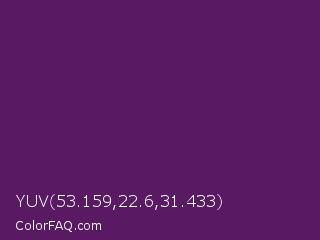 YUV 53.159,22.6,31.433 Color is a dark magenta color and the nearest color is Honey Flower #4f1c70. Hex code #591a63 and RGB value is rgb(89,26,99). In RGB color space, this color is composed of 35% red, 10% green, 39% blue, In CMYK color space, this color is composed of 10% cyan, 74% magenta, 0% yellow , 61% black , In HSL color space, this color has a hue angle of 292° , 58% saturation and 25% lightness.