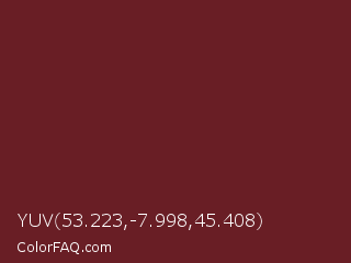 YUV 53.223,-7.998,45.408 Color is a dark red color and the nearest color is Persian Plum #701c1c. Hex code #691e25 and RGB value is rgb(105,30,37). In RGB color space, this color is composed of 41% red, 12% green, 15% blue, In CMYK color space, this color is composed of 0% cyan, 71% magenta, 65% yellow , 59% black , In HSL color space, this color has a hue angle of 354° , 56% saturation and 26% lightness.