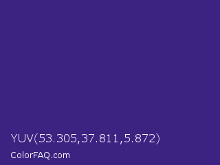 YUV 53.305,37.811,5.872 Color is a normal indigo color and the nearest color is Meteorite #3c1f76. Hex code #3c2382 and RGB value is rgb(60,35,130). In RGB color space, this color is composed of 24% red, 14% green, 51% blue, In CMYK color space, this color is composed of 54% cyan, 73% magenta, 0% yellow , 49% black , In HSL color space, this color has a hue angle of 256° , 58% saturation and 32% lightness.