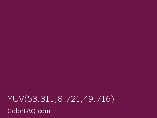 YUV 53.311,8.721,49.716 Color is a dark magenta color and the nearest color is Pansy Purple #78184a. Hex code #6e1547 and RGB value is rgb(110,21,71). In RGB color space, this color is composed of 43% red, 8% green, 28% blue, In CMYK color space, this color is composed of 0% cyan, 81% magenta, 35% yellow , 57% black , In HSL color space, this color has a hue angle of 326° , 68% saturation and 26% lightness.