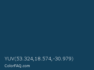 YUV 53.324,18.574,-30.979 Color is a very dark blue color and the nearest color is Teal Blue #044259. Hex code #12405b and RGB value is rgb(18,64,91). In RGB color space, this color is composed of 7% red, 25% green, 36% blue, In CMYK color space, this color is composed of 80% cyan, 30% magenta, 0% yellow , 64% black , In HSL color space, this color has a hue angle of 202° , 67% saturation and 21% lightness.