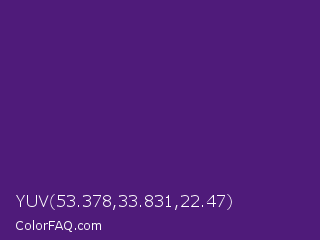 YUV 53.378,33.831,22.47 Color is a dark purple color and the nearest color is Honey Flower #4f1c70. Hex code #4f1b7a and RGB value is rgb(79,27,122). In RGB color space, this color is composed of 31% red, 11% green, 48% blue, In CMYK color space, this color is composed of 35% cyan, 78% magenta, 0% yellow , 52% black , In HSL color space, this color has a hue angle of 273° , 64% saturation and 29% lightness.