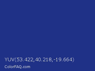 YUV 53.422,40.218,-19.664 Color is a normal blue color and the nearest color is Bay Of Many #273a81. Hex code #1f3187 and RGB value is rgb(31,49,135). In RGB color space, this color is composed of 12% red, 19% green, 53% blue, In CMYK color space, this color is composed of 77% cyan, 64% magenta, 0% yellow , 47% black , In HSL color space, this color has a hue angle of 230° , 63% saturation and 33% lightness.