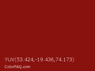 YUV 53.424,-19.436,74.173 Color is a dark red color and the nearest color is Falu Red #801818. Hex code #8a120e and RGB value is rgb(138,18,14). In RGB color space, this color is composed of 54% red, 7% green, 5% blue, In CMYK color space, this color is composed of 0% cyan, 87% magenta, 90% yellow , 46% black , In HSL color space, this color has a hue angle of 2° , 82% saturation and 30% lightness.