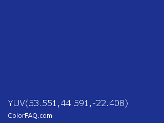YUV 53.551,44.591,-22.408 Color is a normal blue color and the nearest color is Jacksons Purple #20208d. Hex code #1c3190 and RGB value is rgb(28,49,144). In RGB color space, this color is composed of 11% red, 19% green, 56% blue, In CMYK color space, this color is composed of 81% cyan, 66% magenta, 0% yellow , 44% black , In HSL color space, this color has a hue angle of 229° , 67% saturation and 34% lightness.