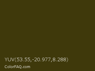 YUV 53.55,-20.977,8.288 Color is a very dark yellow color and the nearest color is Camouflage #3c3910. Hex code #3f390b and RGB value is rgb(63,57,11). In RGB color space, this color is composed of 25% red, 22% green, 4% blue, In CMYK color space, this color is composed of 0% cyan, 10% magenta, 83% yellow , 75% black , In HSL color space, this color has a hue angle of 53° , 70% saturation and 15% lightness.