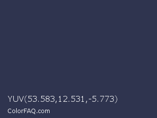 YUV 53.583,12.531,-5.773 Color is a dark blue color and the nearest color is Martinique #363050. Hex code #2f344f and RGB value is rgb(47,52,79). In RGB color space, this color is composed of 18% red, 20% green, 31% blue, In CMYK color space, this color is composed of 41% cyan, 34% magenta, 0% yellow , 69% black , In HSL color space, this color has a hue angle of 231° , 25% saturation and 25% lightness.
