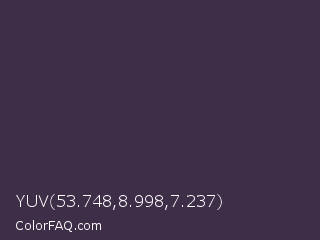 YUV 53.748,8.998,7.237 Color is a dark purple color and the nearest color is Martinique #363050. Hex code #3e2e48 and RGB value is rgb(62,46,72). In RGB color space, this color is composed of 24% red, 18% green, 28% blue, In CMYK color space, this color is composed of 14% cyan, 36% magenta, 0% yellow , 72% black , In HSL color space, this color has a hue angle of 277° , 22% saturation and 23% lightness.