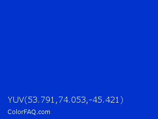 YUV 53.791,74.053,-45.421 Color is a normal blue color and the nearest color is Absolute Zero #0048ba. Hex code #0233cc and RGB value is rgb(2,51,204). In RGB color space, this color is composed of 1% red, 20% green, 80% blue, In CMYK color space, this color is composed of 99% cyan, 75% magenta, 0% yellow , 20% black , In HSL color space, this color has a hue angle of 225° , 98% saturation and 40% lightness.