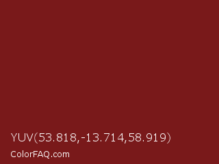 YUV 53.818,-13.714,58.919 Color is a dark red color and the nearest color is Falu Red #801818. Hex code #79191a and RGB value is rgb(121,25,26). In RGB color space, this color is composed of 47% red, 10% green, 10% blue, In CMYK color space, this color is composed of 0% cyan, 79% magenta, 79% yellow , 53% black , In HSL color space, this color has a hue angle of 359° , 66% saturation and 29% lightness.
