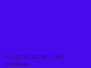 YUV 53.84,90.298,17.68 Color is a normal indigo color and the nearest color is Han Purple #5218fa. Hex code #4a08ed and RGB value is rgb(74,8,237). In RGB color space, this color is composed of 29% red, 3% green, 93% blue, In CMYK color space, this color is composed of 69% cyan, 97% magenta, 0% yellow , 7% black , In HSL color space, this color has a hue angle of 257° , 93% saturation and 48% lightness.